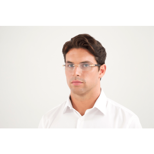 Contemporary yet sophisticated reinterpretation of the historical Décor C temple in combi version. Timeless and easy-to-wear rimless rectangular shape. Iconic Décor C detail perfectly inserted in the acetate temples as aesthetical and functional element of the hinge. Precious finish in gold and platinum combined with varied acetate colours.