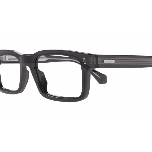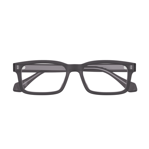 Metal core with Godron décor visible in the inner part of the temple through a bilayer acetate with crystal effect. Classic rectangular shape in a bold acetate frame. Double C logo photo engraved on the end-piece and Cartier logo plaque on temples. Enhanced grip on temple tips to guarantee maximum comfort.