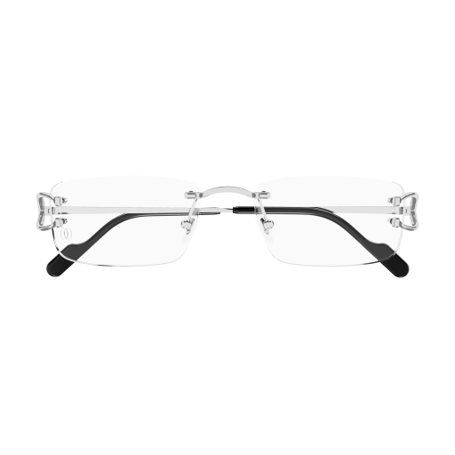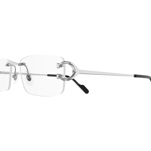 New modern execution of the C Décor aesthetics strongly linked to its historical DNA. Rectangular rimless construction embellished by the iconic C decor detail on the hinge. Acetate temple tips enriched by the Cartier logo plaque.