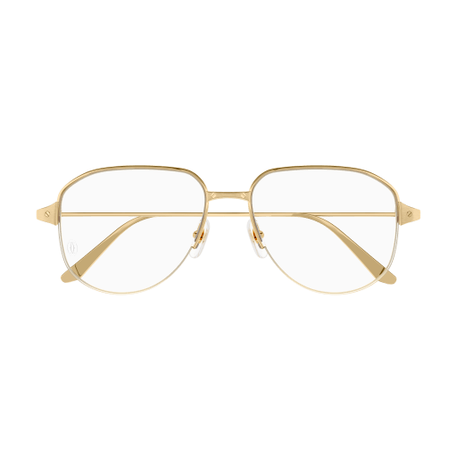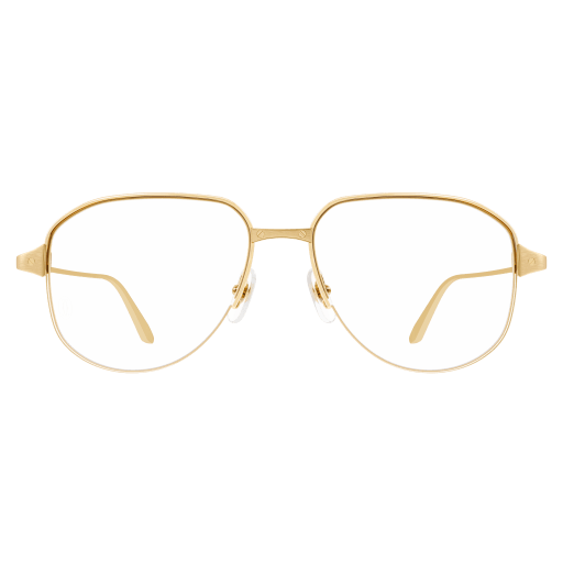 Iconic Santos Light aesthetics combined with a masculine single bridge pilot shape. Identifiable Santos screws décor, symbol of the Santos de Cartier collection, on the half-rim bridge and hinges as an aesthetic part of the element. Light and sophisticated temples with Cartier logo engraved. Double C Décor signature on the nose pads, and precious finish in gold