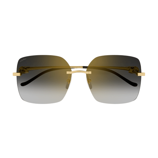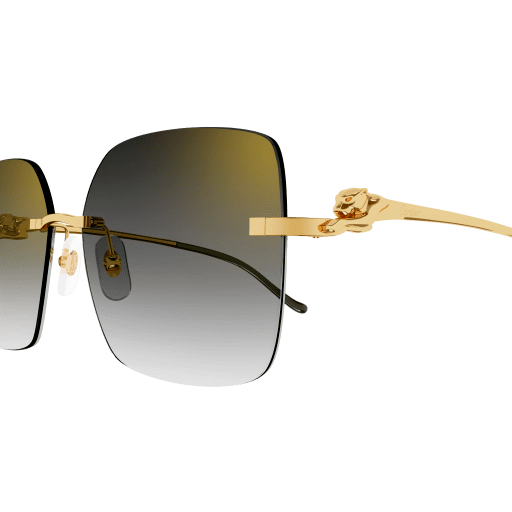 Rimless squared sun style for an elegant and feminine look. Dynamic sculptured Panthère head and body on metal temples. Acetate temple tips recalling the Panthère tail movement. Precious finish in gold.