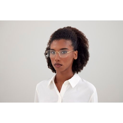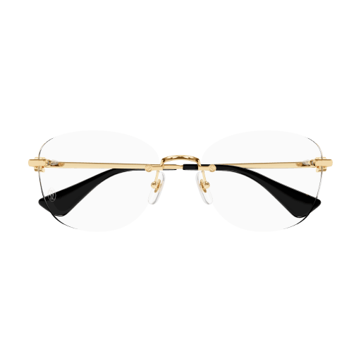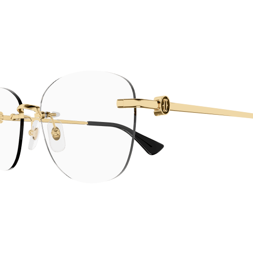 New full metal construction characterized by elegant and sophisticated design inspired by the Double C leather goods collection. Modern soft cat-eye shape with rimless construction. Iconic Double C detail played as jewellery signature and enriched by enamel with tone on tone colour pairing the lens colour. Precious finish in gold and platinum, Cartier logo on acetate temple tips and Double C décor on nosepads.