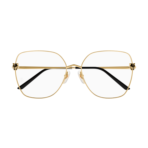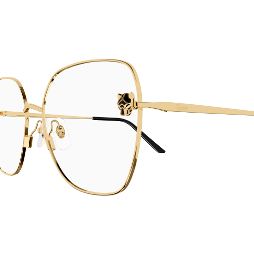 New Panthère aesthetics characterized by an innovative three-dimensional Panthère head with geometric facets, enriched by enamel details. Classic squared shape recalling the geometric lines of the Panthère head. Precious finish in gold and platinum and acetate temple tips to guarantee comfort.