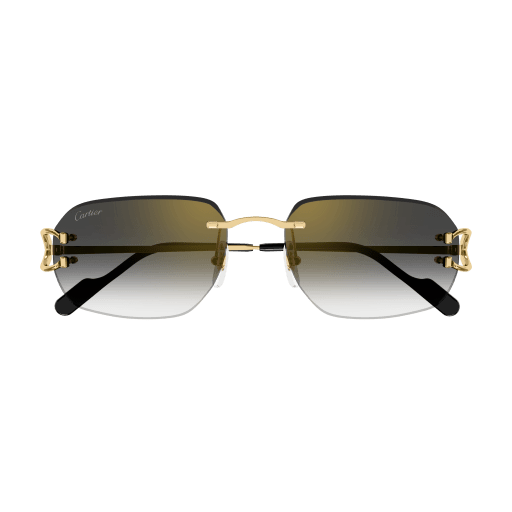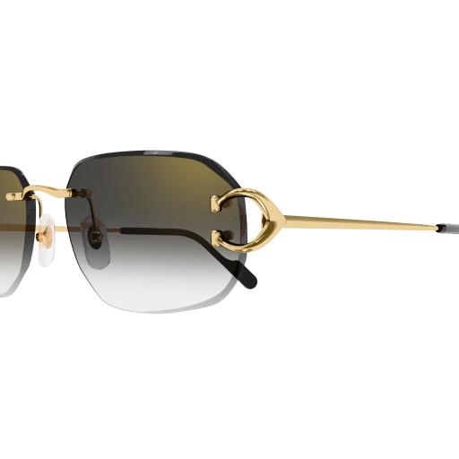 Sunglass rimless construction enriched by the iconic C Dècor detail being a functional and aesthetical element of the metal hinge. New easy-to-wear soft rectangular shape with colourful lenses embellished with a sophisticated beveled treatment to ensure a unisex and modern look. Acetate temple tips with Cartier logo tag to guarantee comfortability. Precious finish in gold.