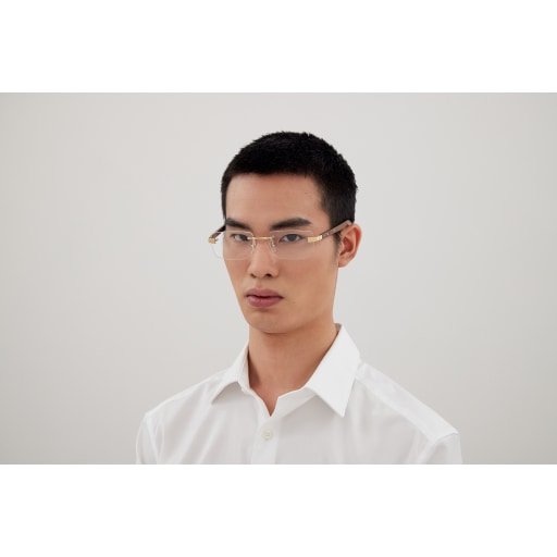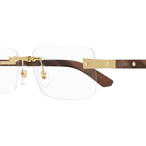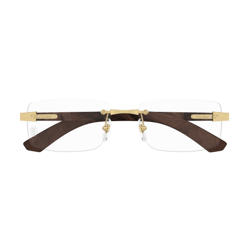Elegant rectangular rimless construction with re-vamped noble materials temples characterized by bolder volumes and harmonious proportions. Santos iconicity further enhanced by the Santos screws directly set on the wood or horn temples. Precious finish in gold or platinum and new wood colours to confer a sophisticated yet contemporary look. Cartier logo engraved on the temples, Santos screws décor on temple tips and Double C Décor on the nose pads.