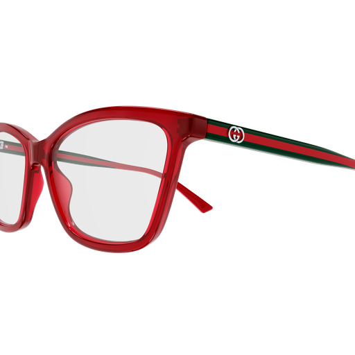 Commercial shape with the iconic web detail as temple. Rectangular soft cat-eye shape paired with super slim temples. Interlocking G Logo. Bi colored palette characterized by commercial front paired with Web stripe (Green-red Green) temples.